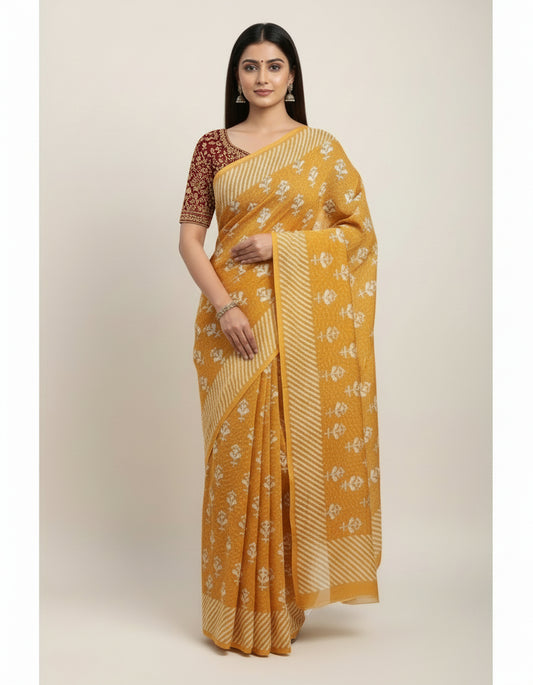 MUSTARD YELLOW HANDBLOCK MULMUL SAREE