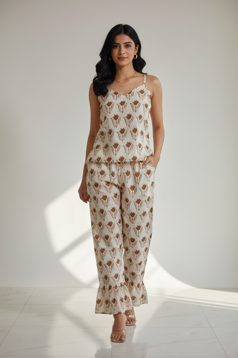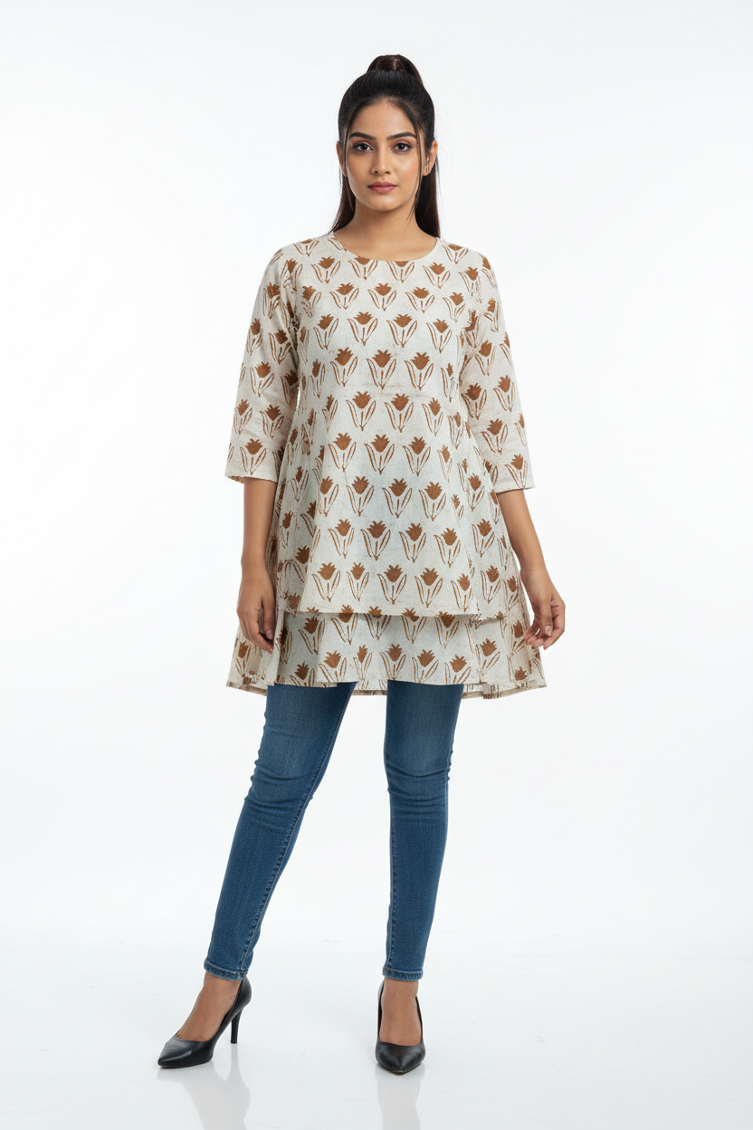 CREAM & BROWN HANDBLOCKED COTTON PRECUT 2.5M FABRIC