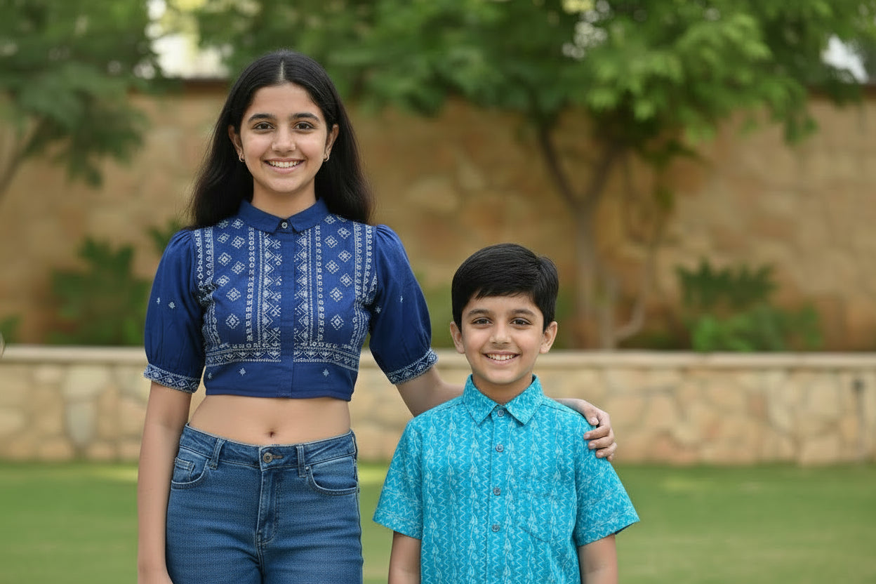 Experience the beauty of pure cotton precut fabric adorned with traditional Bagru, Indigo, and Dabu hand-blocked patterns. This 2.5-meter fabric is soft, breathable, and eco-friendly, crafted by skilled artisans who keep ancient techniques alive. Made from 100% cotton, it ensures comfort throughout the day and is naturally dyed for safe, sustainable use.