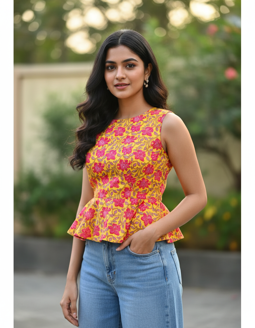 YELLOW & PINK HANDBLOCKED COTTON PRECUT 2.5M FABRIC